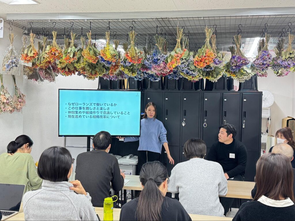 当日は、ソーシャルビジネス領域での起業を目指す方や、障害者福祉事業所を経営されている方などが参加。ローランズで働くスタッフとの交流を通じて、現場での工夫や働き方について意見を交わすとともに、ローランズのビジネスモデルについて学びを深めていただきました。