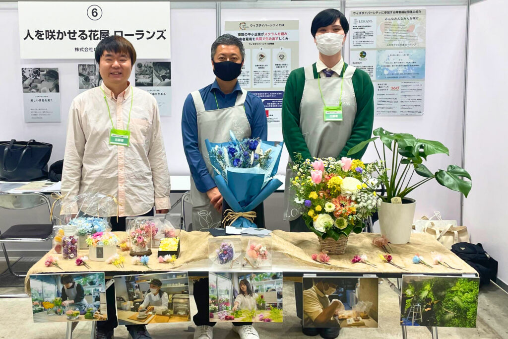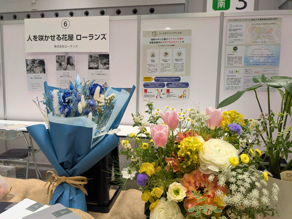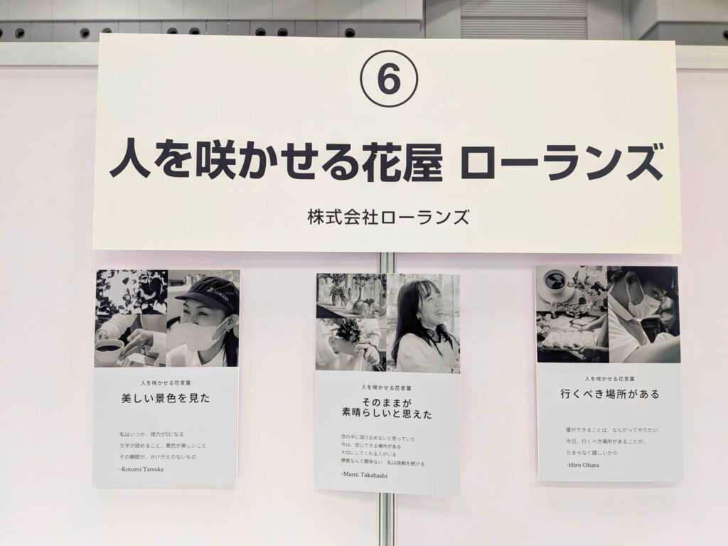 ローランズのブースでは、「人を咲かせる花屋」をテーマに、実際に働くスタッフの言葉をご紹介しました。一人ひとりがどのような想いで仕事と向き合っているのか、スタッフの声を通じて、障害の有無にかかわらず「だれもが咲ける」職場づくりの取り組みについてお伝えしました。