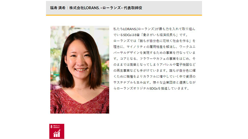 WDGs / Women Development Goals 2020 1/01 メディア 2020年1月1日 SDGs週間に合わせた“女性が手掛けるSDGs”の紹介で代表福寿の想いが紹介されました。 メディア 生活情報誌 月刊ぷらざ OZ MAGAZINE 関連記事 ローランズ代表の福寿が吹田市主催トークイベント『進歩と調和のその先へ ~障がい福祉からはじまるまちのアップデート〜』 に登壇します(2026年2月15日) 2026年1月6日 【プレスリリース】花屋ローランズ(東京都渋谷区)、障害者・就労困難者の雇用数100名を突破〜障害者の「憧れの仕事で働く」という選択肢を広げたい 2025年12月19日 ローランズ代表の福寿が「誰もが働ける社会をつくる ソーシャルファームを知って、考えて、動きたくなるワークショップ2025 第4回」に登壇しました(2025年12月18日) 2025年12月18日 ローランズ代表の福寿が日本ポジティブサイコロジー医学会学術集会の招待講演でお話しました(2025年12月14日) 2025年12月14日 LITALICO仕事ナビにローランズを掲載いただきました 2025年12月8日 ローランズ代表の福寿が町田商工会議所主催「障がい者雇用セミナー」に登壇しました(2025年12月8日) 2025年12月8日 ボーダレス・アカデミー「ソーシャル・アントレプレナーシップツアー」がローランズで開催されました(2025年12月6日) 2025年12月6日 年末年始 休業期間のお知らせ(2025年 – 2026年) 2025年11月25日