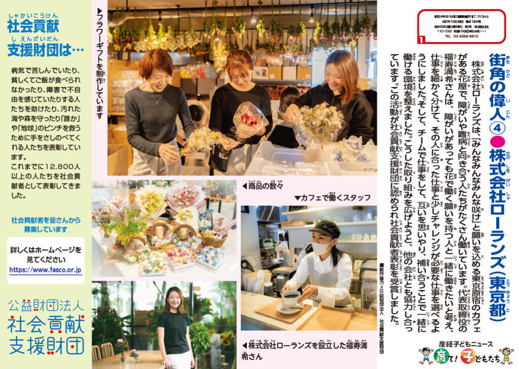全国の小中学校などに配布掲示される「産経子どもニュース」の「街角の偉人」に株式会社ローランズを掲載いただきました。社会貢献者表彰受賞者の活動が子どもたちにもわかりやすく紹介されているものです。