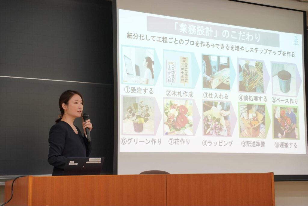 福寿からは、従業員140人のうち約100人が障害当事者や難病と向き合いながら働くスタッフであるローランズの特徴を紹介するとともに、大学生に向けて次のようなメッセージをお伝えしました。