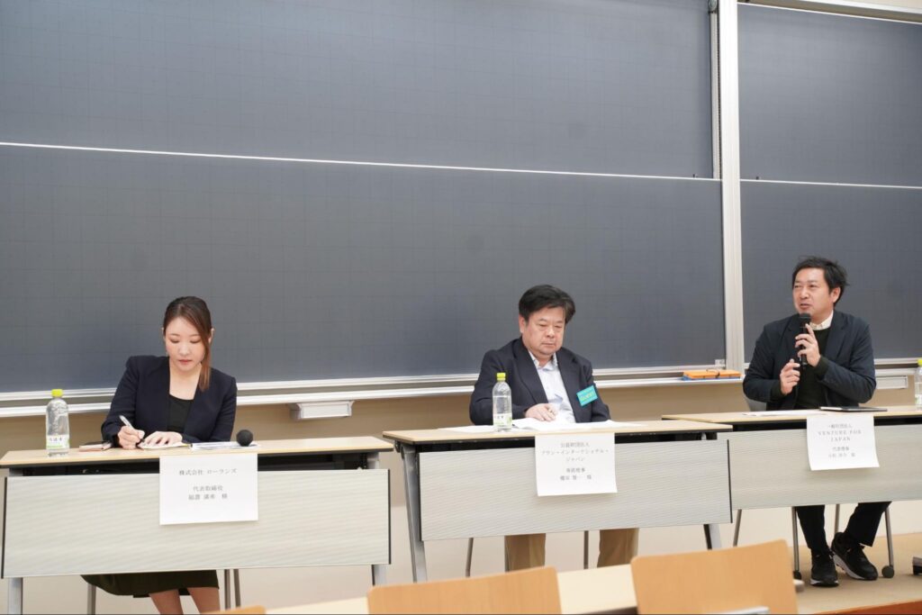 今回は「若手人材の活躍に向けて」をテーマに、ローランズのほか、公益財団法人プラン・インターナショナル・ジャパン 代表理事・専務理事の棚田氏、一般社団法人VENTURE FOR JAPAN 代表理事の小松氏が登壇しました。各団体の事業紹介に加え、西武信用金庫の髙橋理事長によるファシリテートのもと、パネルディスカッションが行われました。
